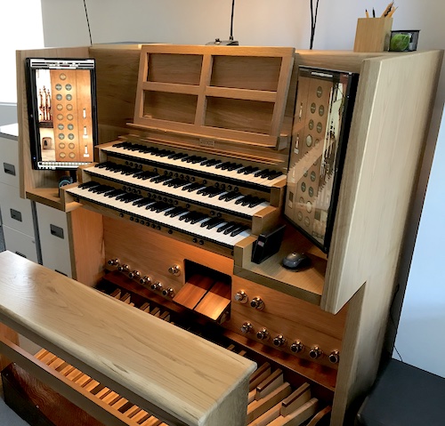 This is a typical example of our Sherwood design. This one is made from cherry veneer and solid red oak. We like contrasting woods. It is fitted with Fatar TP/60 keyboards and a refinished redundant pipe organ pedal board. Twin touchscreens allow easy stop control with multiple sample sets. The computer is concealed inside the case.